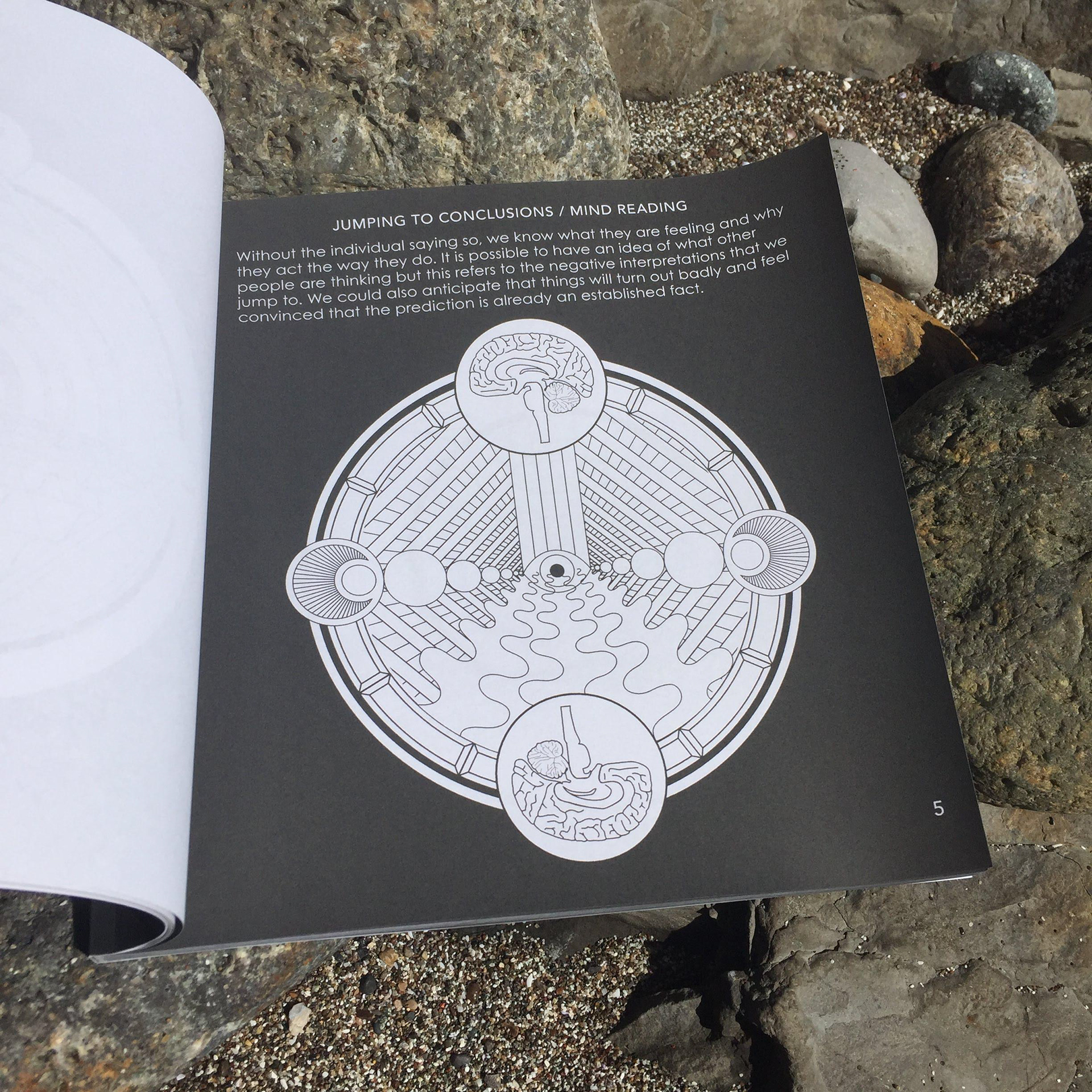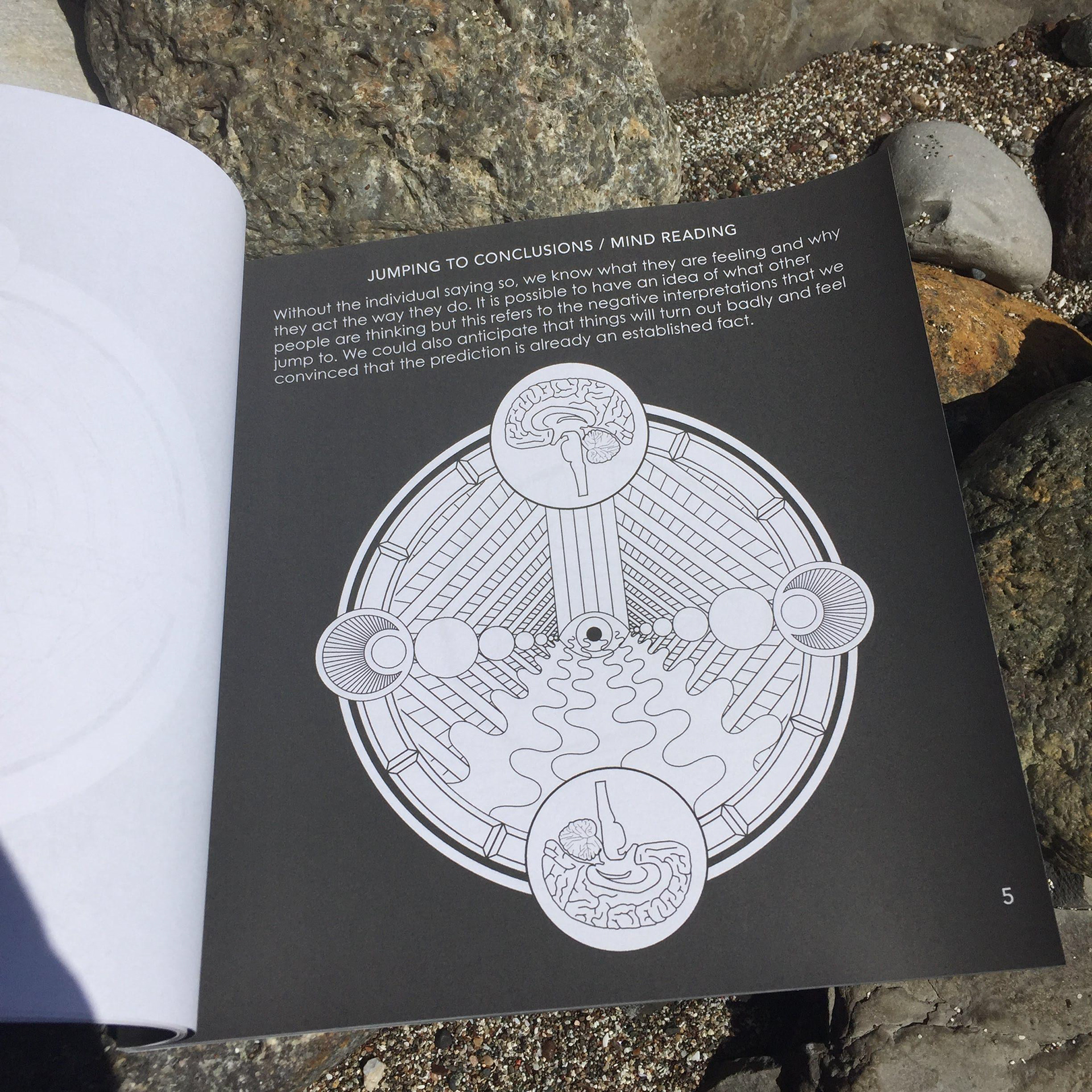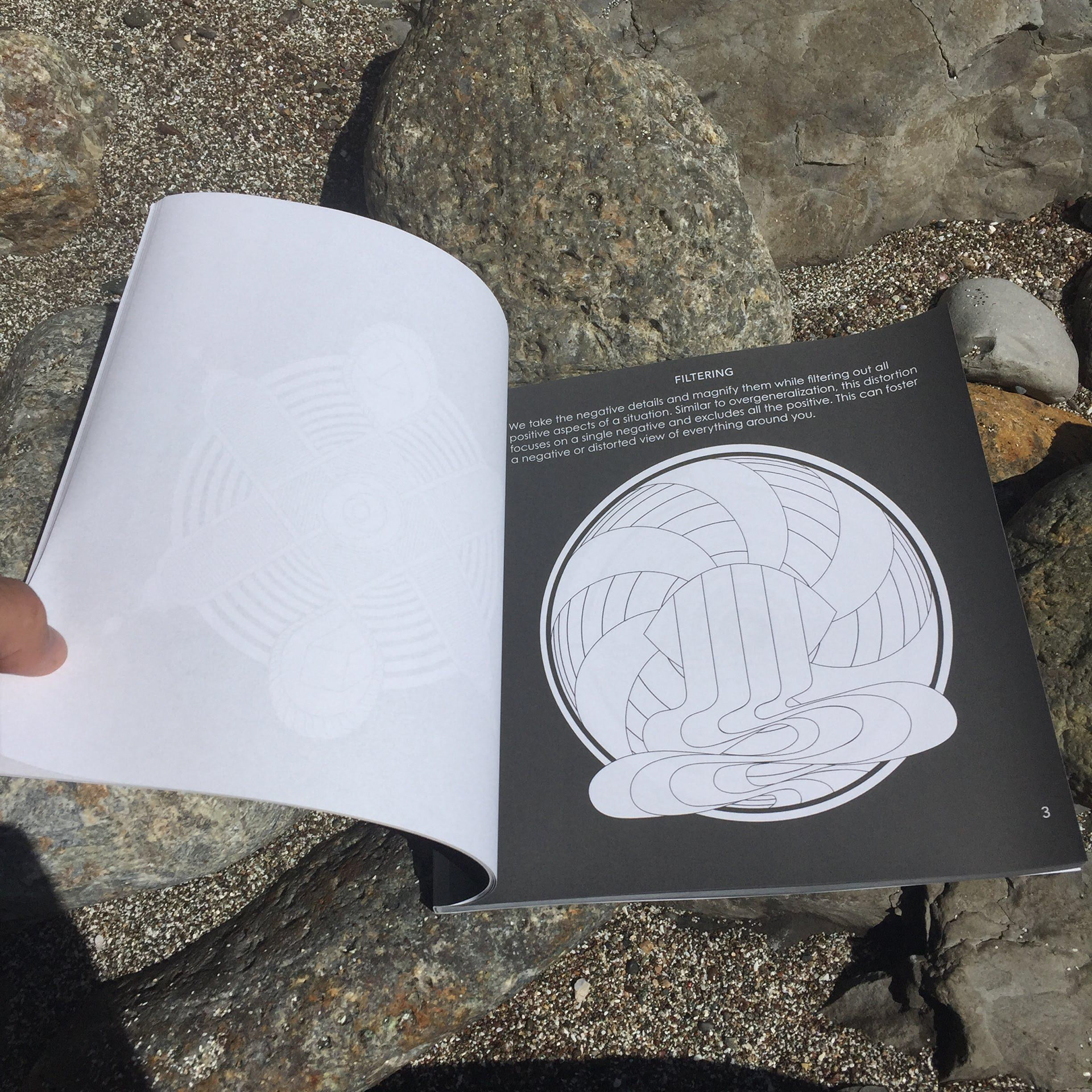An adult coloring book with visualizations of Aaron Beck's Cognitive Distortions. Intention is to have the person color the page while meditating or thinking about their negative thought patterns.